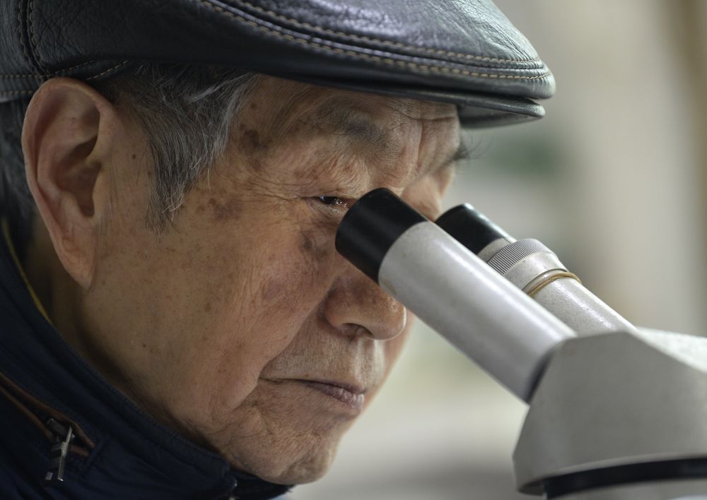 ↑1月14日,费梁在办公室内进行蛙类骨骼研究。