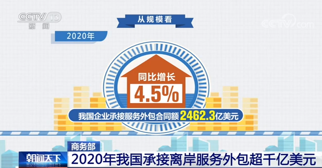 从规模看,2020年我国企业承接服务外包合同额2462.3亿美元,同比增长4.5%;其中承接离岸服务外包合同额1404.1亿美元,实现“十三五”超千亿美元的发展目标。