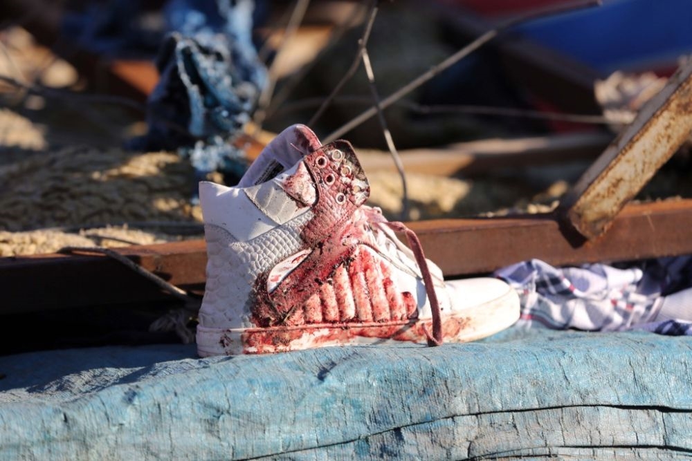 这是1月21日在伊拉克巴格达的爆炸袭击事件现场拍摄的沾有血迹的鞋。(新华社发)
