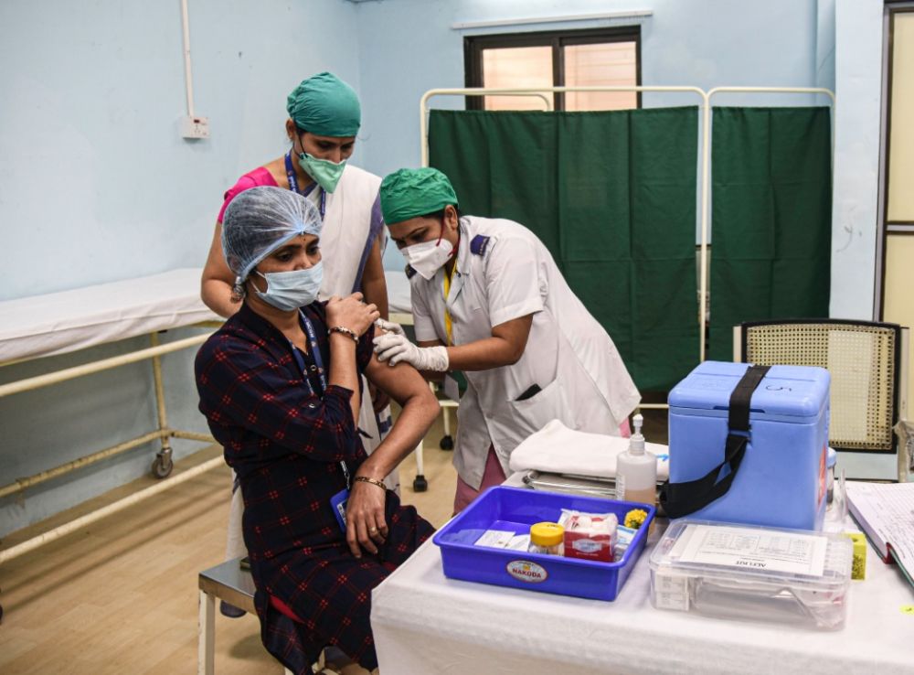 1月16日,在印度孟买,医护人员为一名女子注射新冠疫苗。(新华社发,法丽哈·法鲁基摄)