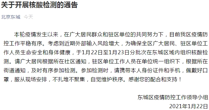 本轮疫情发生以来,在广大居民群众和驻区单位的共同努力下,目前我区疫情防控工作平稳有序。考虑到近期外部输入风险增大,为确保全区广大居民、驻区单位工作人员生命安全和身体健康,于1月22日至1月23日分批次在东城区域内组织核酸检测。请广大居民根据所在社区通知,驻区单位工作人员在单位统一组织下,根据所在街道通知,及时有序参加检测。参加检测时,请携带本人身份证件和手机,佩戴好口罩,服从现场安排,不扎堆不聚集,自觉维护秩序。感谢您的配合和支持!