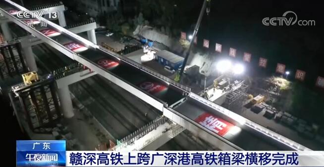 当天凌晨4时,箱梁横移至既定位置,标志着赣深高铁上跨广深港高铁的箱梁横移施工顺利完成。