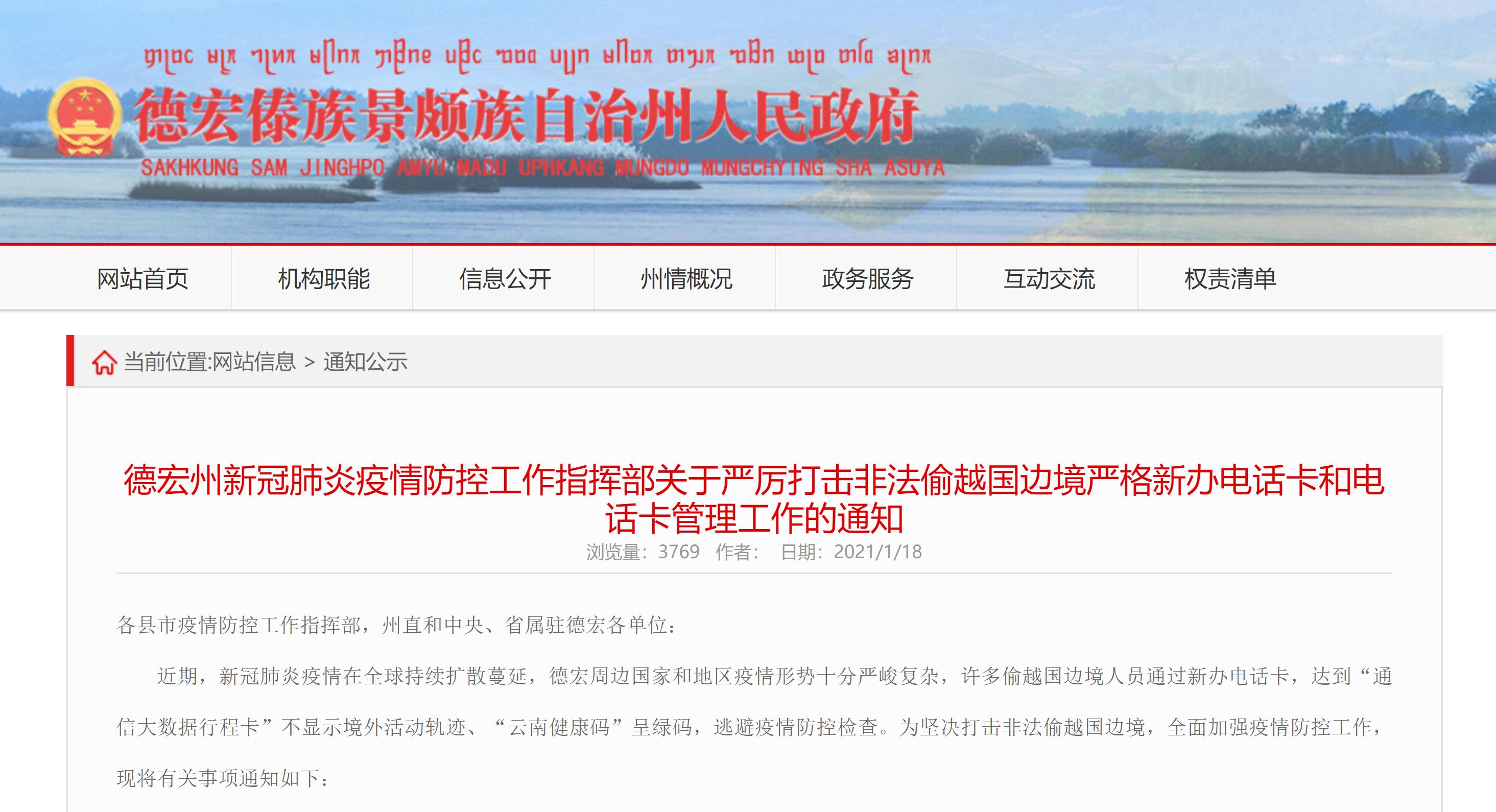 为坚决打击非法偷越国边境,全面加强疫情防控工作,德宏州要求州内电信运营企业必须严格执行办理电话卡实名制,创新运用人工智能等技术手段,确保电话入网环节人证一致,深入防范治理二次倒卖电话卡,积极防范用户名下不知情办卡。州外人员在德宏州内新开、补办电话卡需持县市疫情防控工作指挥部开具的证明或者指挥部委托相关部门开具的证明。各县市指挥部统筹好证明开具工作,积极主动做好服务工作。