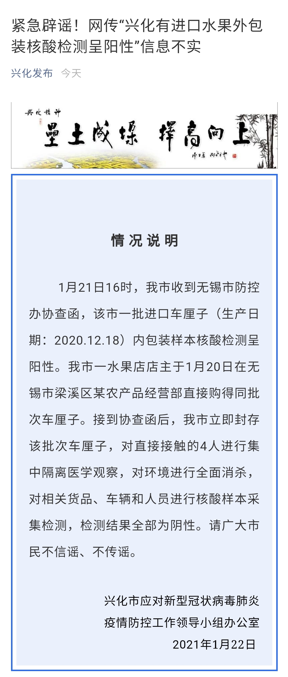 江苏省兴化市人民政府发布消息称:1月21日16时,兴化市收到无锡市防控办协查函,该市一批进口车厘子(生产日期:2020.12.18)内包装样本核酸检测呈阳性。兴化市一水果店店主于1月20日在无锡市梁溪区某农产品经营部直接购得同批次车厘子。接到协查函后,兴化市立即封存该批次车厘子,对直接接触的4人进行集中隔离医学观察,对环境进行全面消杀,对相关货品、车辆和人员进行核酸样本采集检测,检测结果全部为阴性。请广大市民不信谣、不传谣。(总台央视记者 黄成)