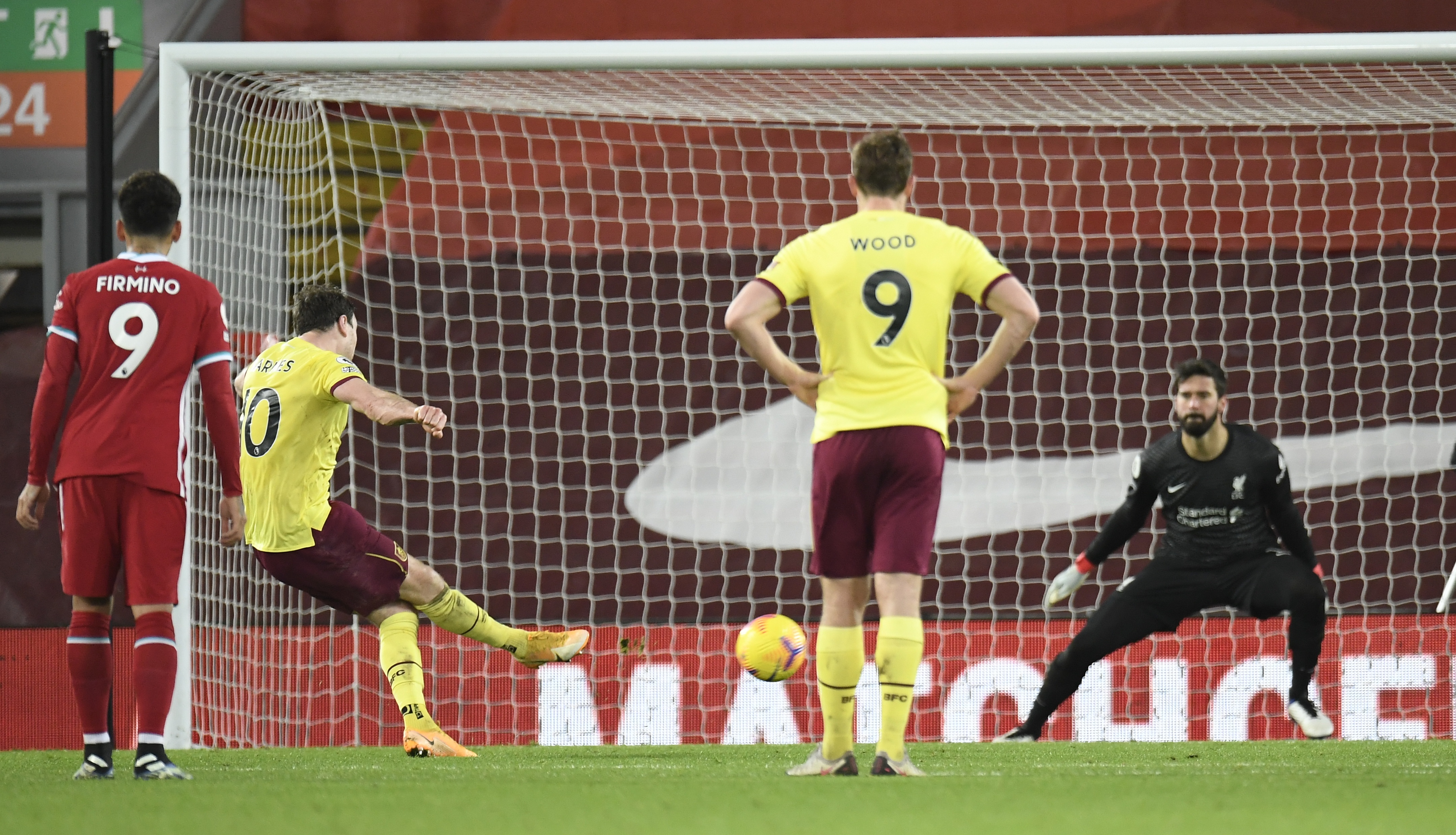 伯恩利则在稳住防守的同时瞄准机会发动反击。比赛最后阶段,客队前锋巴恩斯带球冲入禁区被利物浦门将阿利松扑倒。巴恩斯第82分钟罚点球命中,就此终结利物浦连续68场英超主场不败的纪录。而这也是1974年来伯恩利首次在安菲尔德球场取胜。