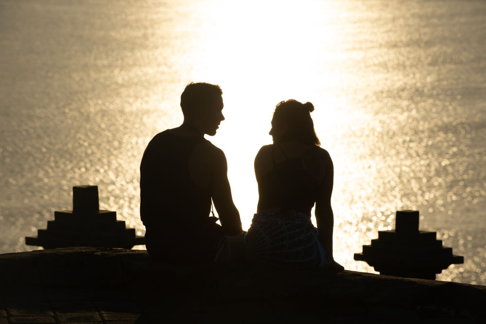 2019年2月25日,在印度尼西亚巴厘岛情人崖,一对情侣欣赏日落景色。(新华社记者杜宇摄)