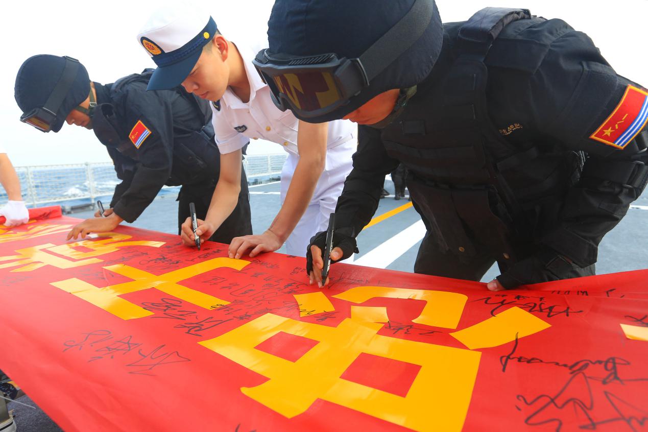 活动现场,伴随编队舰艇汽笛长鸣,任务官兵面向国旗庄严敬礼。在编队指挥员的领誓下,全体官兵重温军人誓词,铭记职责使命。随后,官兵依次走向签字台,在横幅上留下自己的名字。