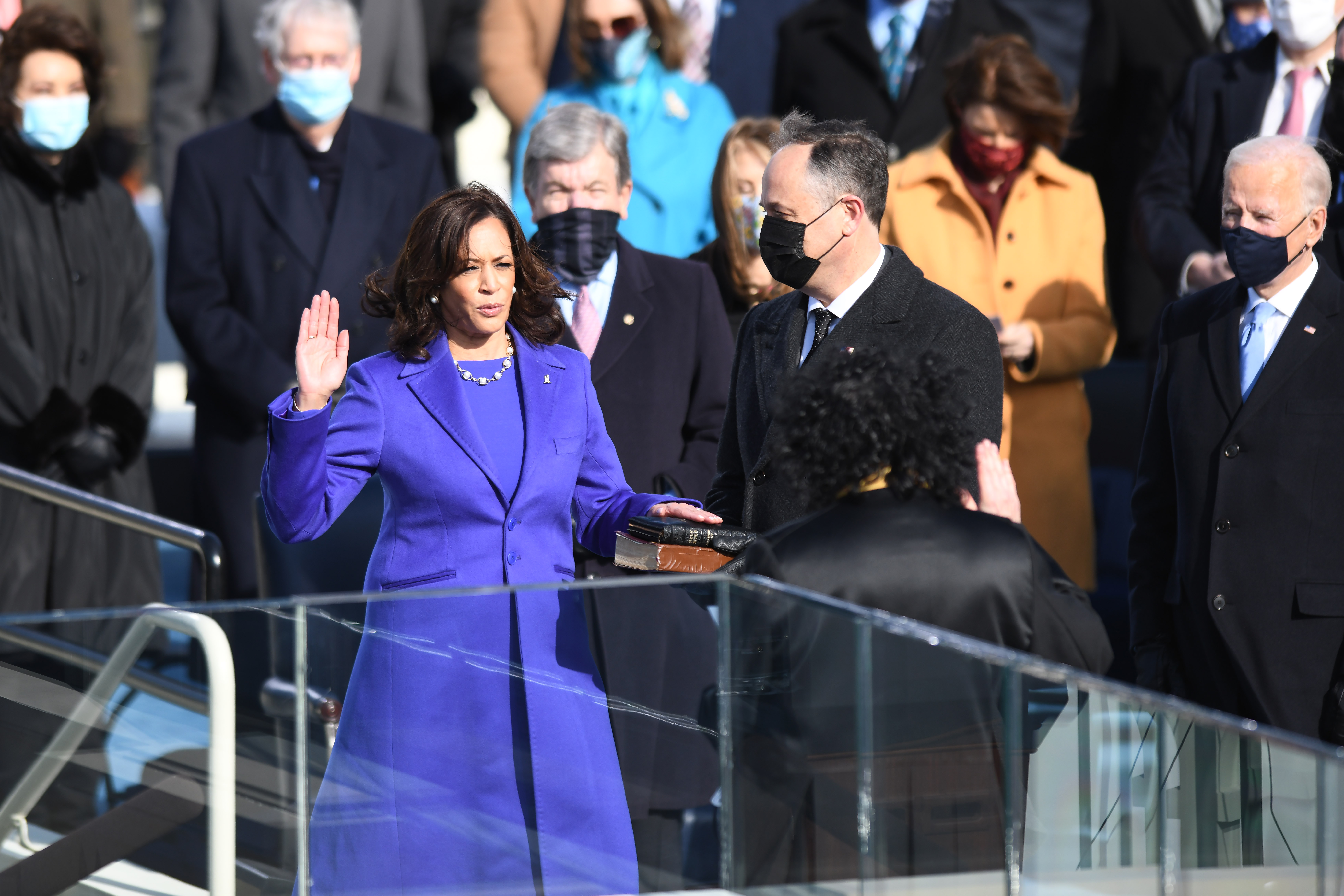 1月20日,在美国首都华盛顿国会山,哈里斯(前左)在就职典礼上宣誓就任美国副总统。(新华社记者刘杰摄)
