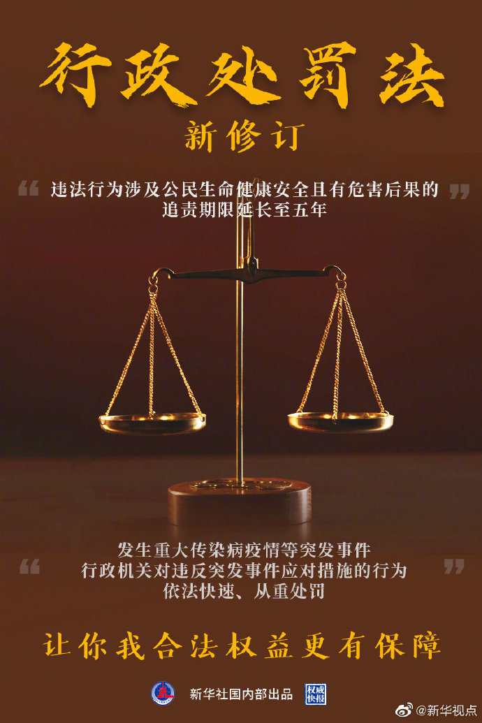 历经三次审议,新行政处罚法来了!1月22日,十三届全国人大常委会第二十五次会议表决通过新修订的行政处罚法。新法明确,违法行为涉及公民生命健康安全、金融安全且有危害后果的,追责期限延长至五年。这部新修订的法律将于2021年7月15日起施行。(记者杨维汉、刘奕湛,海报设计:张晨光)