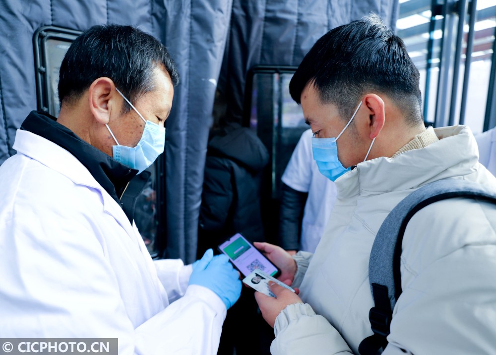 ↑2021年1月21日,在张掖火车西站出站口,新冠疫情防控综合检查组的工作人员在查验旅客健康码和身份证。CICPHOTO/王将 摄