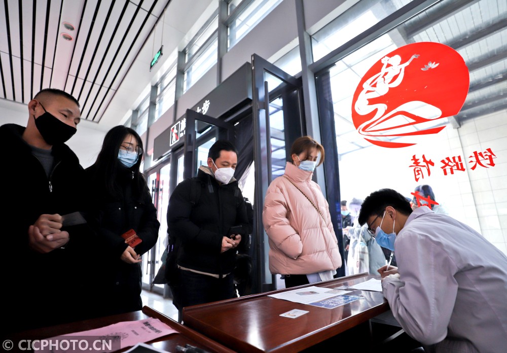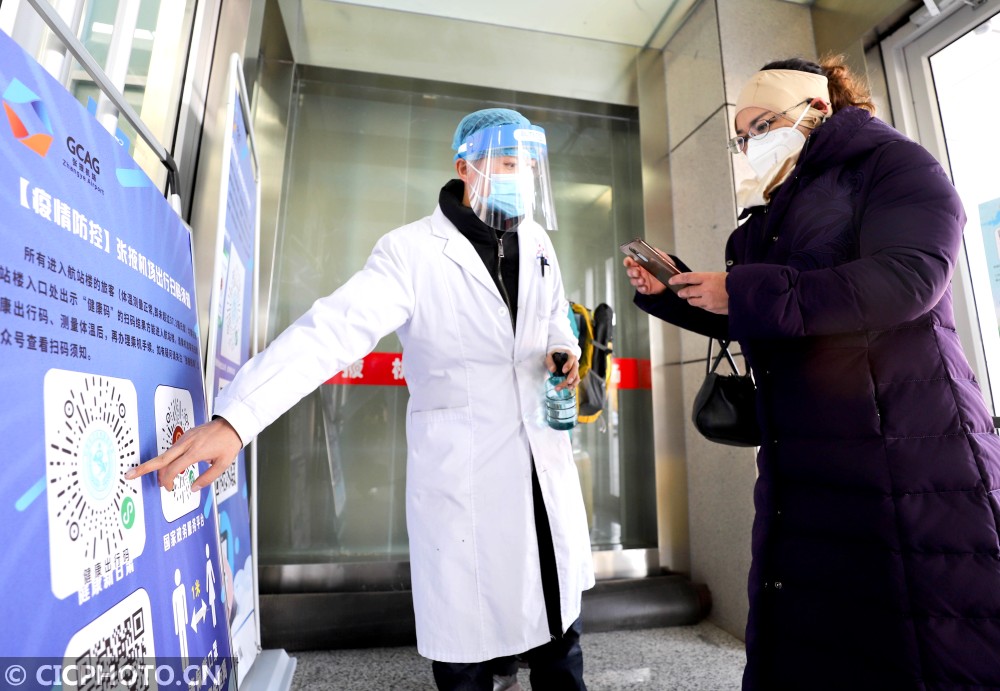 ↑2021年1月21日,在张掖火车站出站口,新冠疫情防控综合检查组的工作人员在指导旅客进行体温检测、健康码查验和登记工作。CICPHOTO/王将 摄