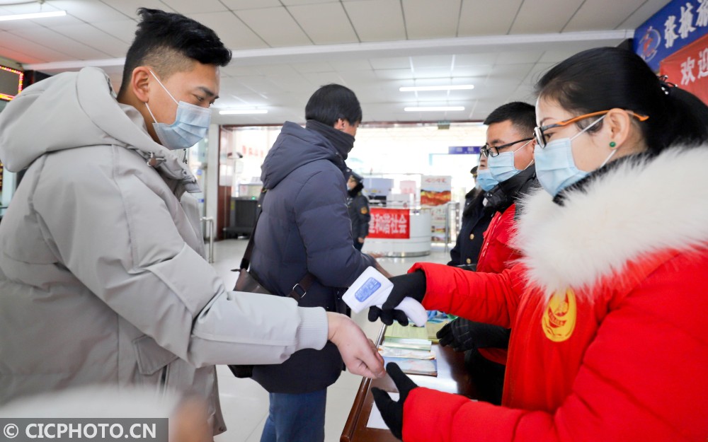↑2021年1月21日,在张掖汽车西站进站口,工作人员在为旅客进行体温检测。CICPHOTO/王将 摄