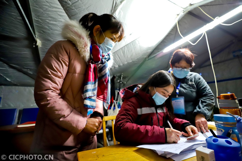 ↑2021年1月21日凌晨,在张掖火车站出站口,新冠疫情防控综合检查组的工作人员在指导旅客进行登记工作。CICPHOTO/王将 摄