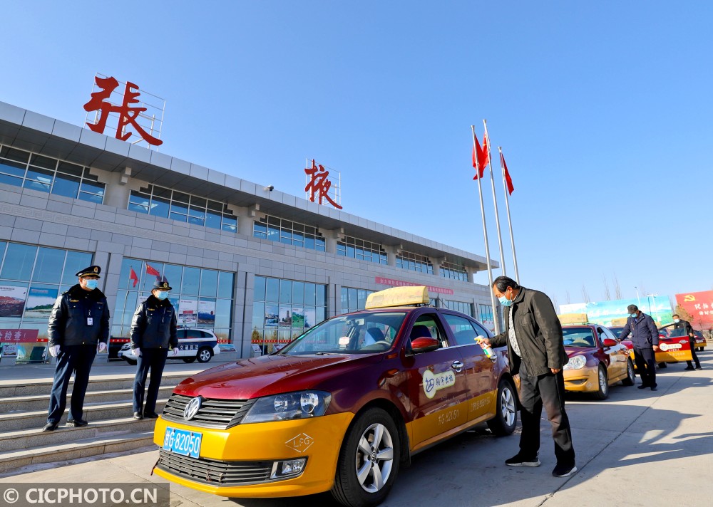 ↑2021年1月21日,在张掖火车站出站口,运输管理部门的工作人员在指导出租车司机进行“一客一消毒”工作。CICPHOTO/王将 摄