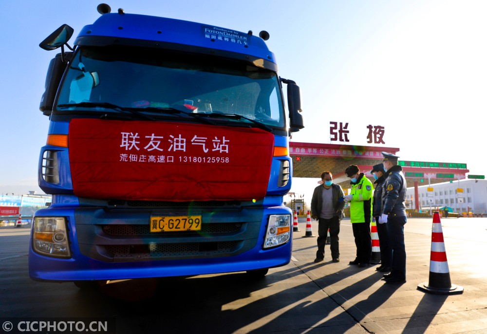 ↑2021年1月21日,在张掖火车西站出站口,交警同道路运输管理的部门工作人员在进行冷链食品货品物流查验。CICPHOTO/王将 摄