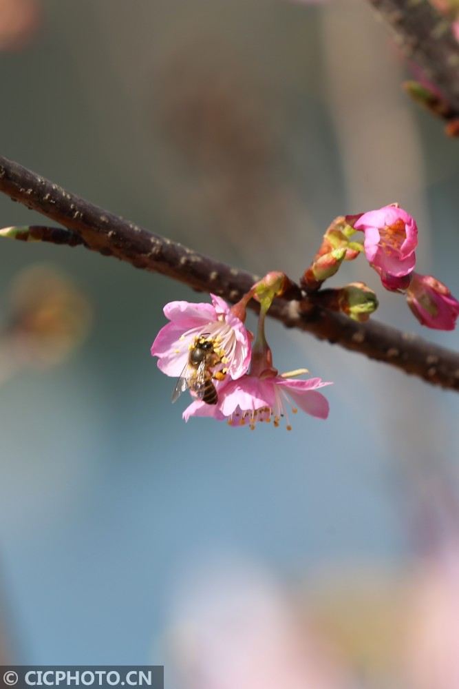 ↑2021年1月18日,在贵州省锦屏县三江镇滨江路,盛开的冬樱花吸引蜜蜂前来采蜜。CICPHOTO/杨晓海 摄