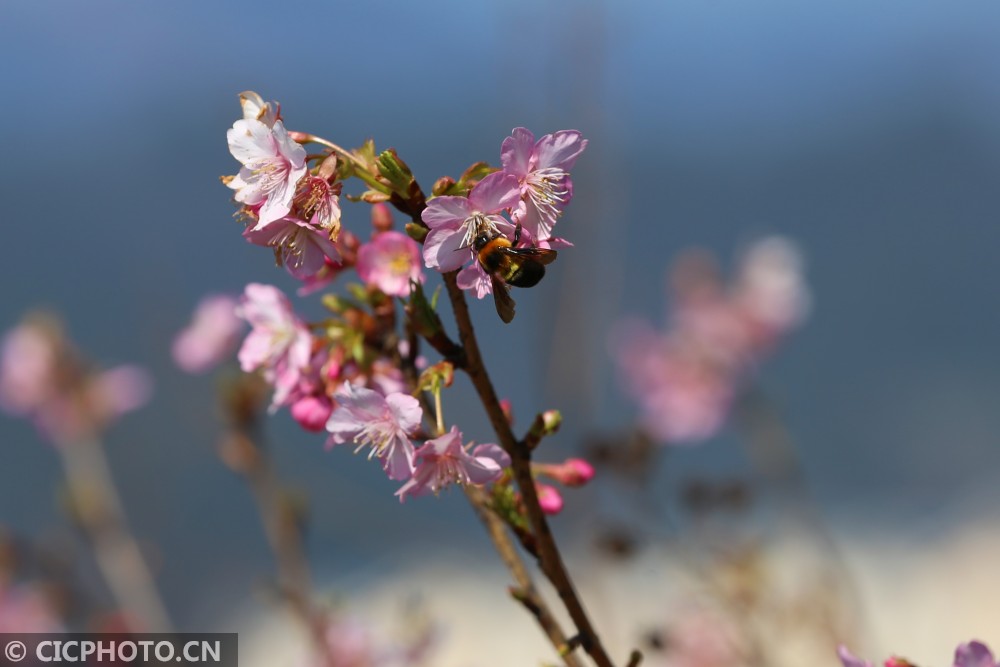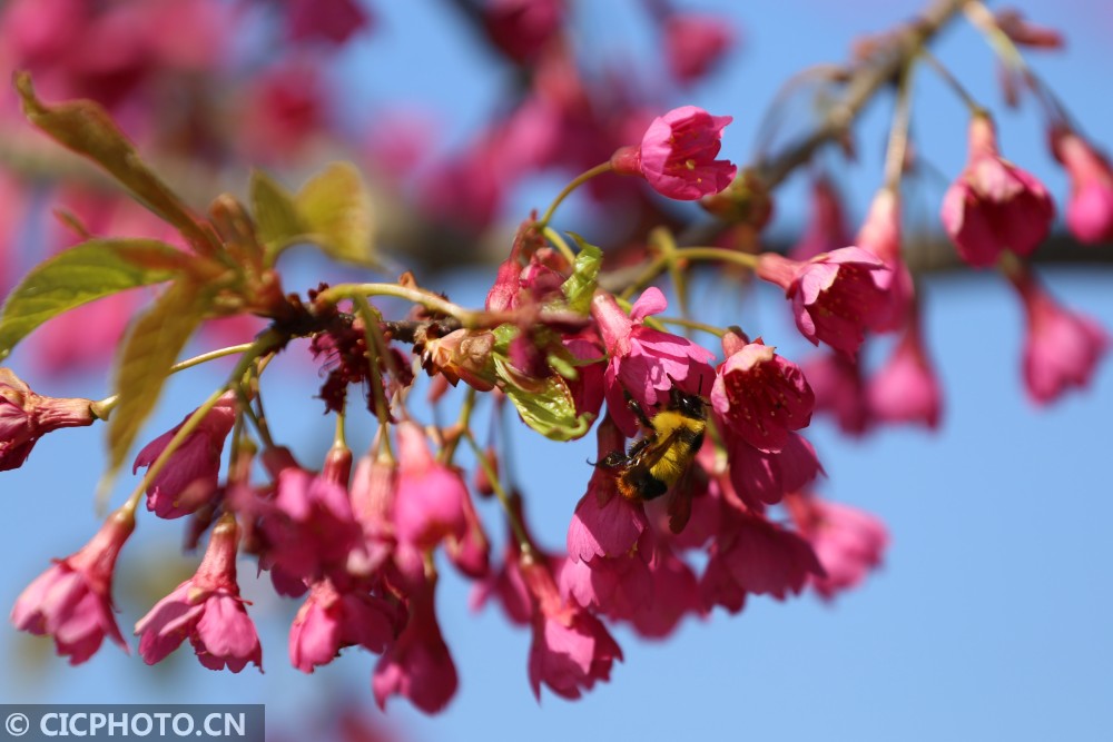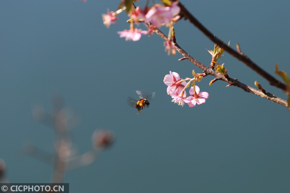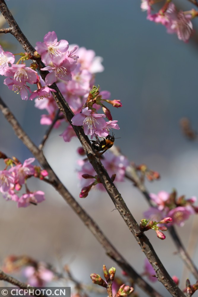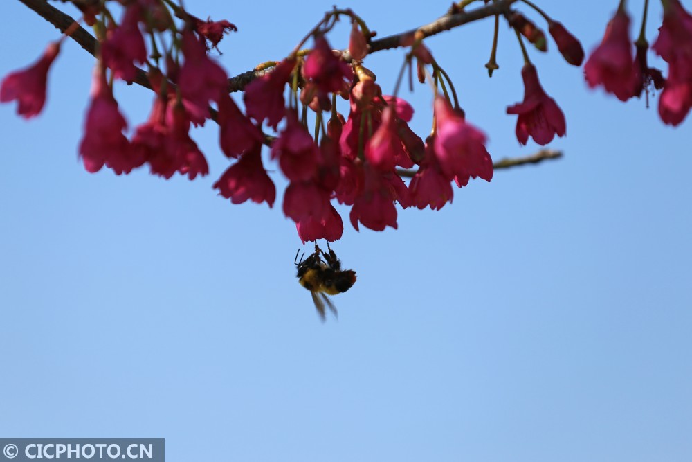 ↑2021年1月18日,在贵州省锦屏县三江镇滨江路,盛开的冬樱花吸引熊蜂前来采蜜。CICPHOTO/杨晓海 摄