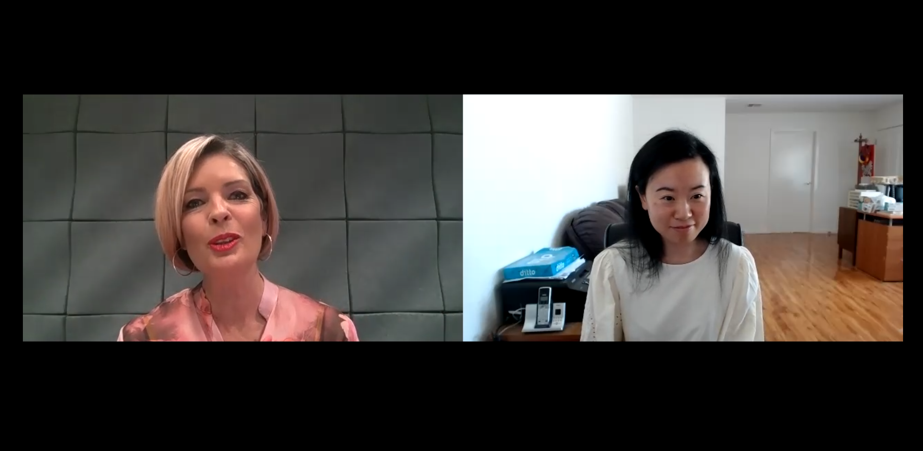 图为霍尔姆斯(左一)在接受新华社记者白旭的视频采访。