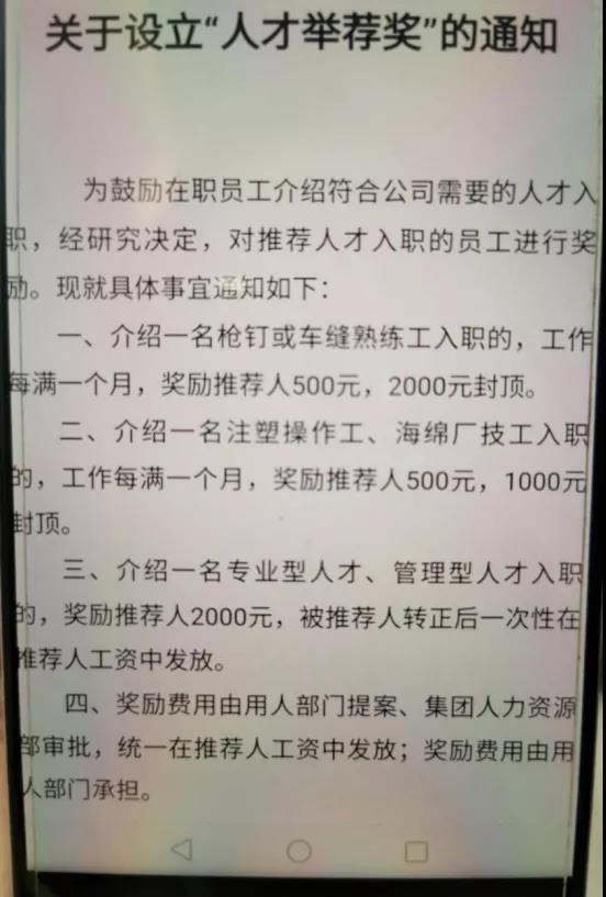 (图片说明)某公司为招工设立的推荐奖励办法 高佳晨拍摄