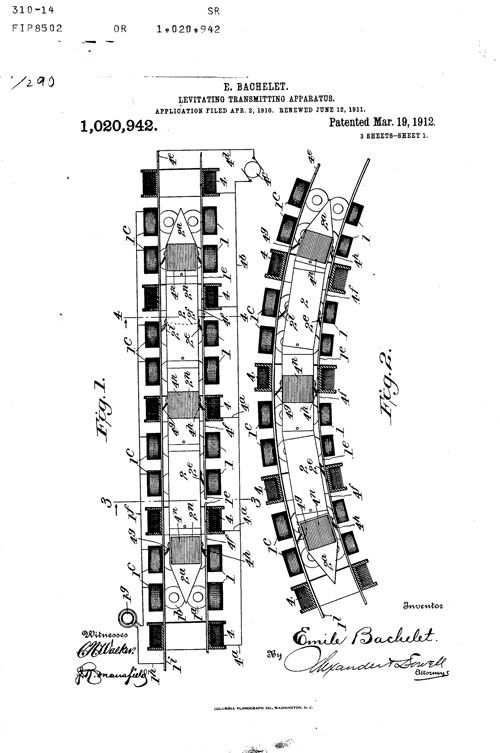 ▲1912年颁发给法裔美国发明家埃米尔·巴切莱特的发明证书,它展示了早期的磁悬浮列车原理。图片来自网络