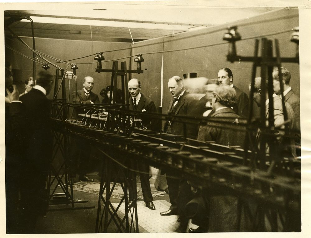 ▲1914年,丘吉尔(图中居右)在伦敦参观世界上第一台磁悬浮列车模型。美国国家历史博物馆馆藏图片