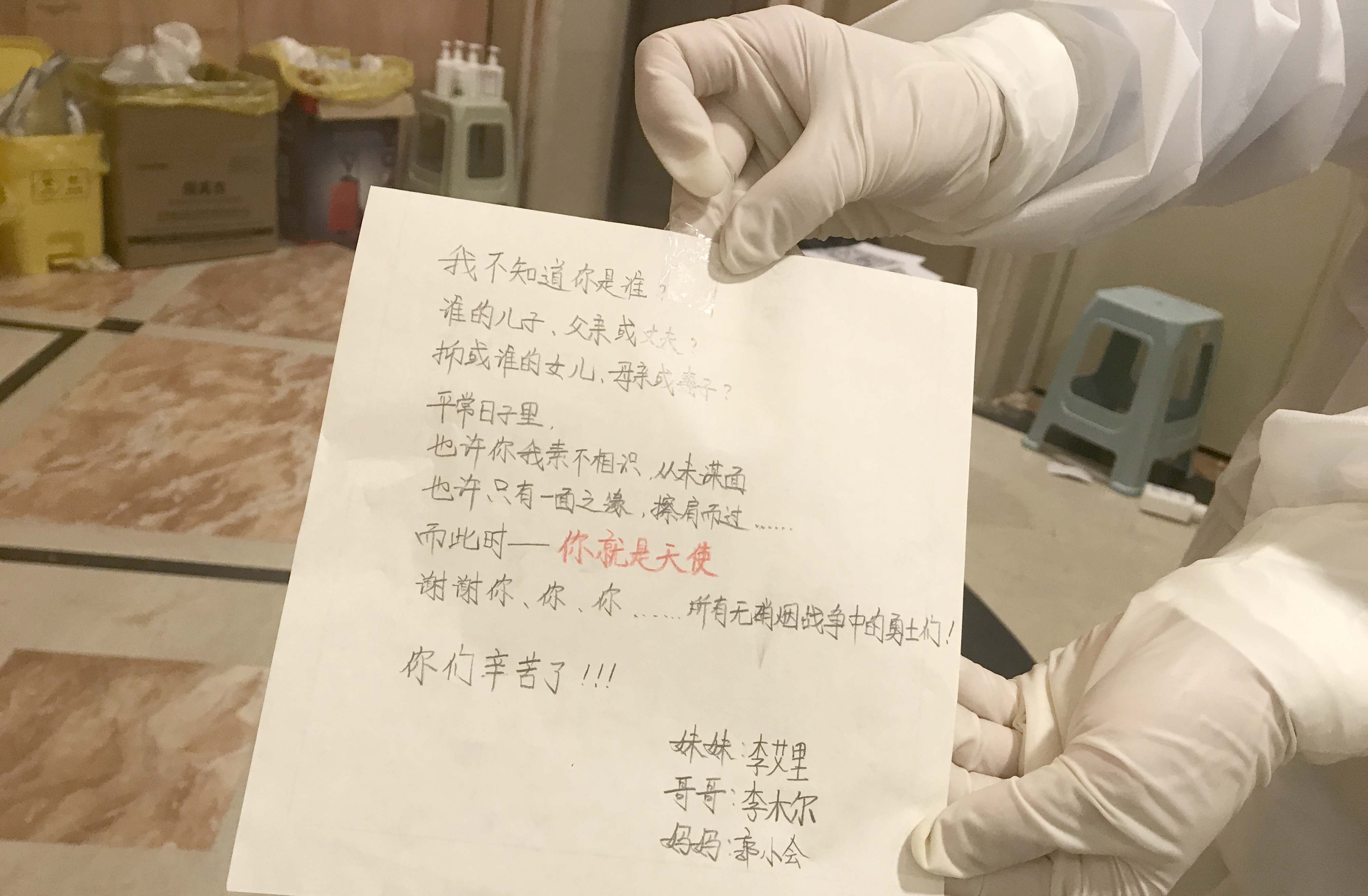这是隔离中的一家三口,妈妈带着孩子们写给医生的诗。诗里面写着:我不知道你是谁,平常日子里,也许你我素不相识,而此时,你就是天使……