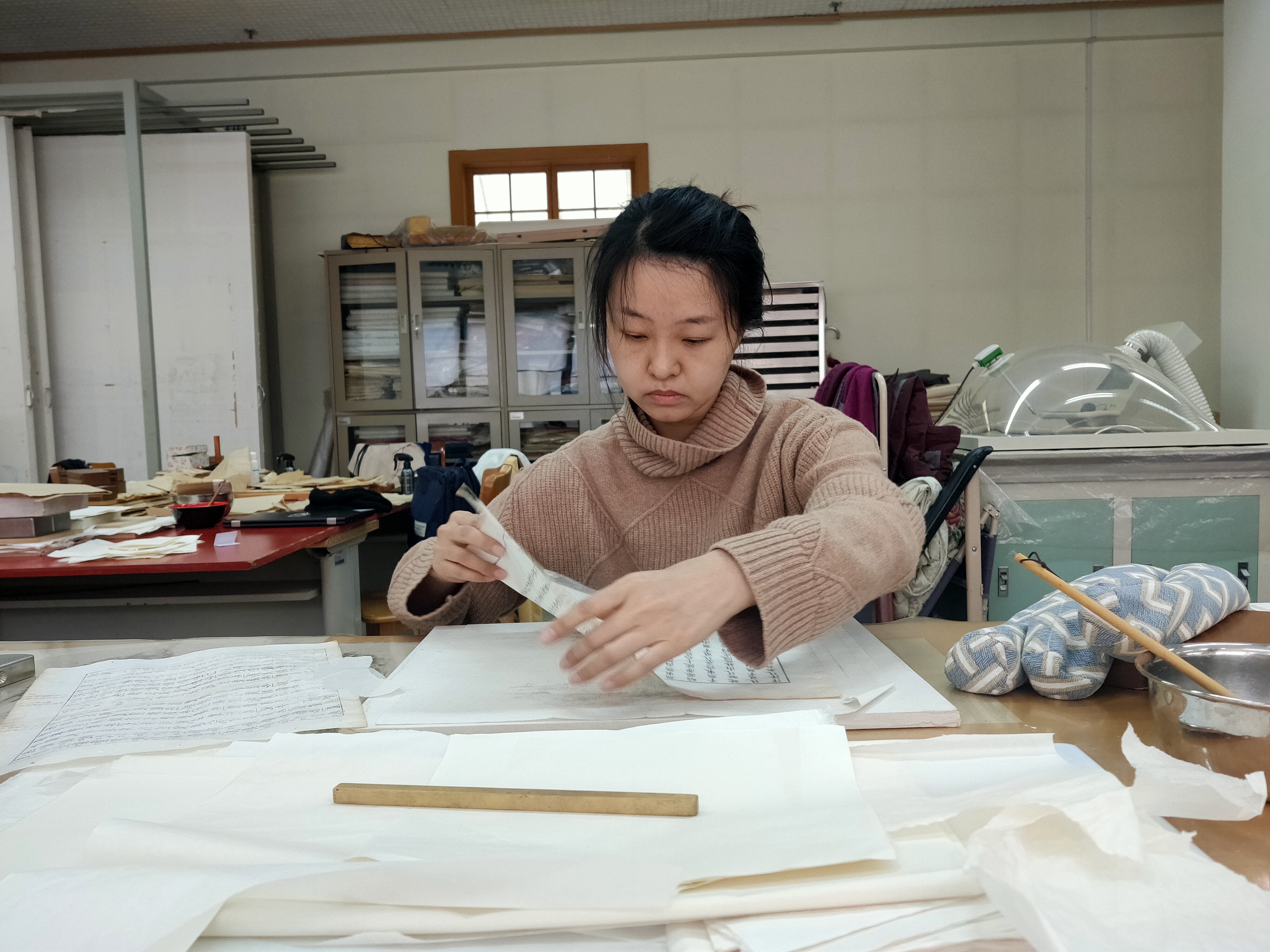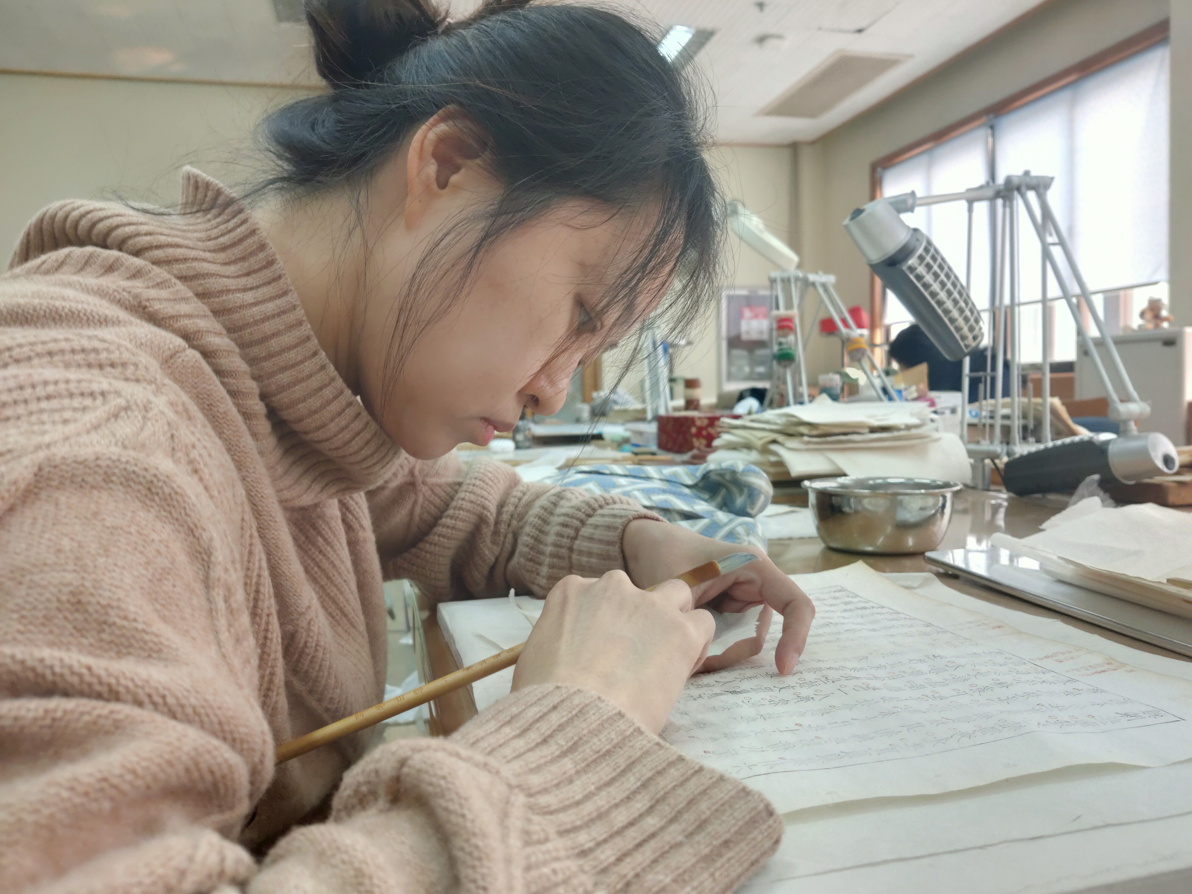 杨林玫坐在桌前,定了定神,轻轻掀起面前铺开的泛黄书页,仔细端详着。然后书页被重新平铺到桌面,她用蘸着糨糊的毛笔尖,小心点了点书页上几处细微的褶皱,定睛来回看了几遍,随后在书页正反两面都垫上吸湿纸,再用灌入钢砂的长条布袋压实。
