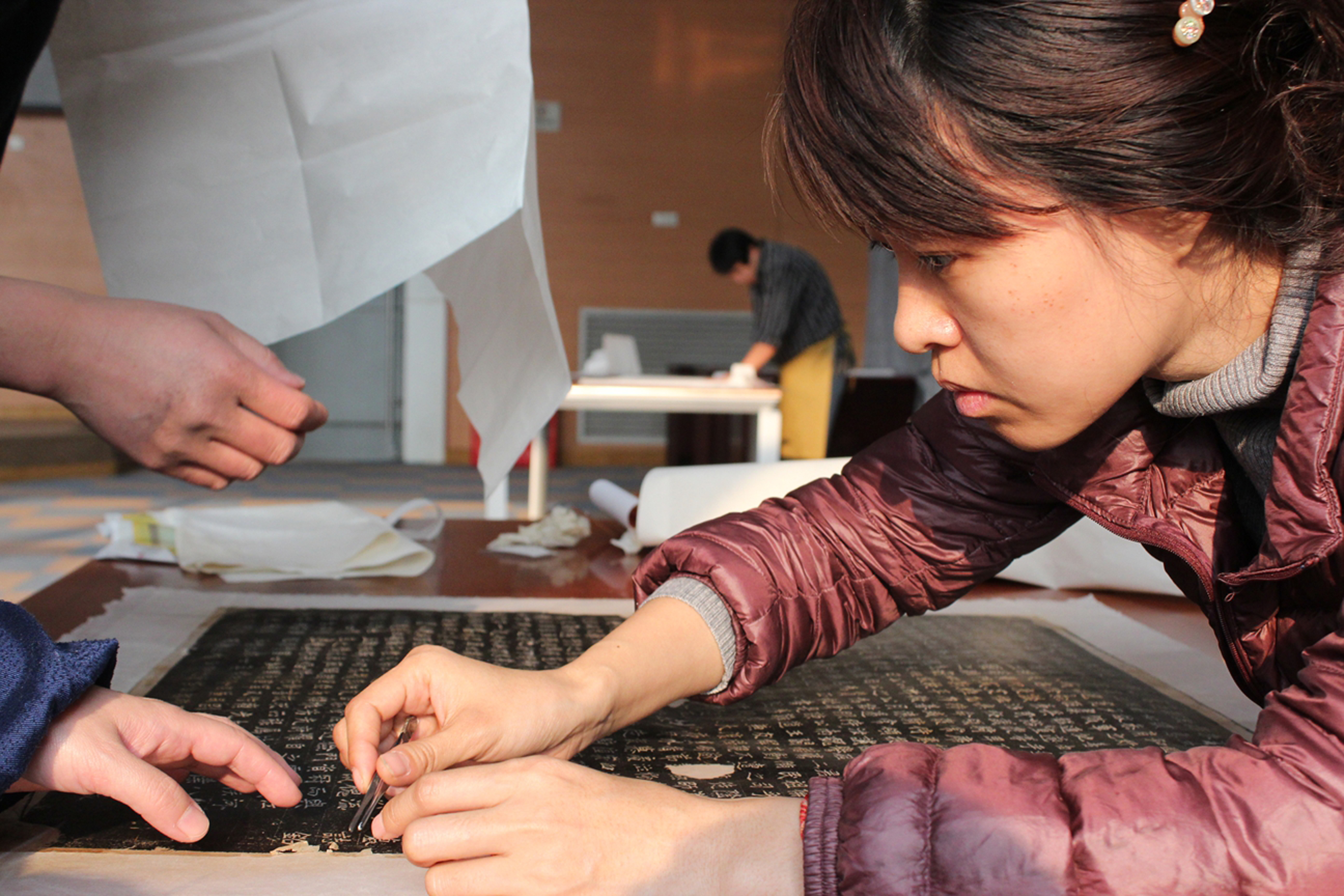 2013年,杨林玫与同事合作修复清代拓片。(山东省图书馆供图)