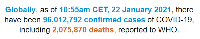 根据世卫组织最新实时统计数据,截至欧洲中部时间1月22日10时55分(北京时间1月22日17时55分),全球累计新冠肺炎确诊病例96012792例,累计死亡病例2075870例。(总台记者 朱赫)