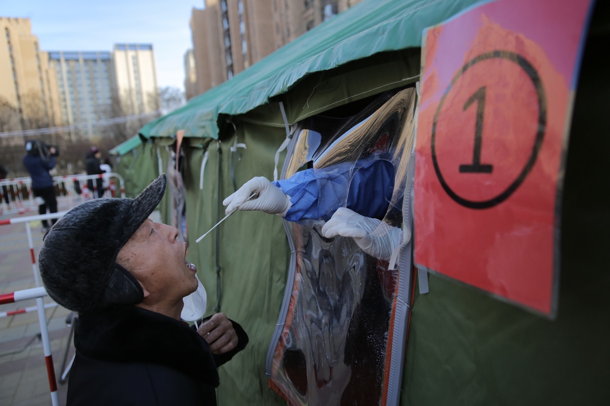 2021年1月3日,北京顺义区双丰街道香悦西区核酸采样点,医务人员对居民进行核酸检测。新京报记者 郑新洽 摄