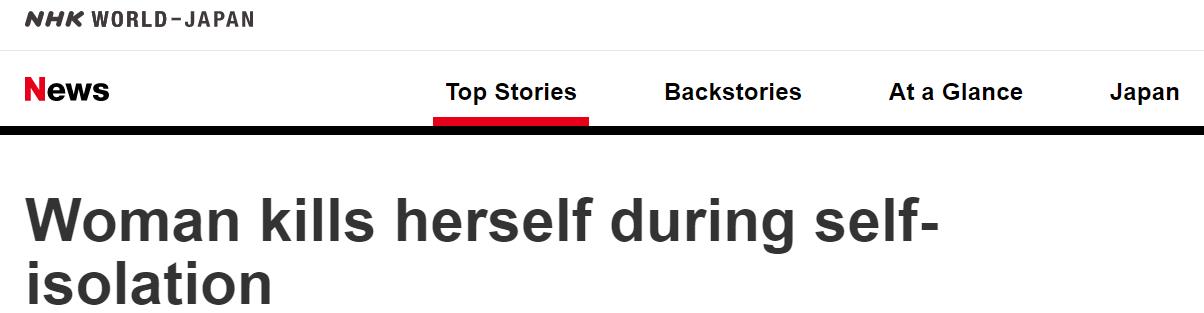 据日本广播协会NHK22日报道,东京一名感染新冠病毒的女性在家中自杀。消息人士称,此前这名自杀的女性得知其新冠病毒检测结果呈阳性后,进行了自我隔离。本月初,该名女性的尸体被发现。