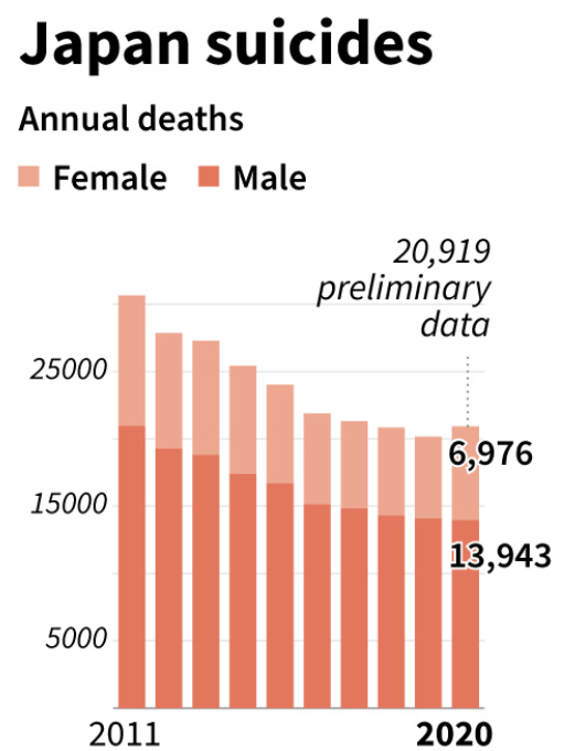 △日本2020年共有20919人自杀身亡,女性自杀人数增幅显然高于男性。