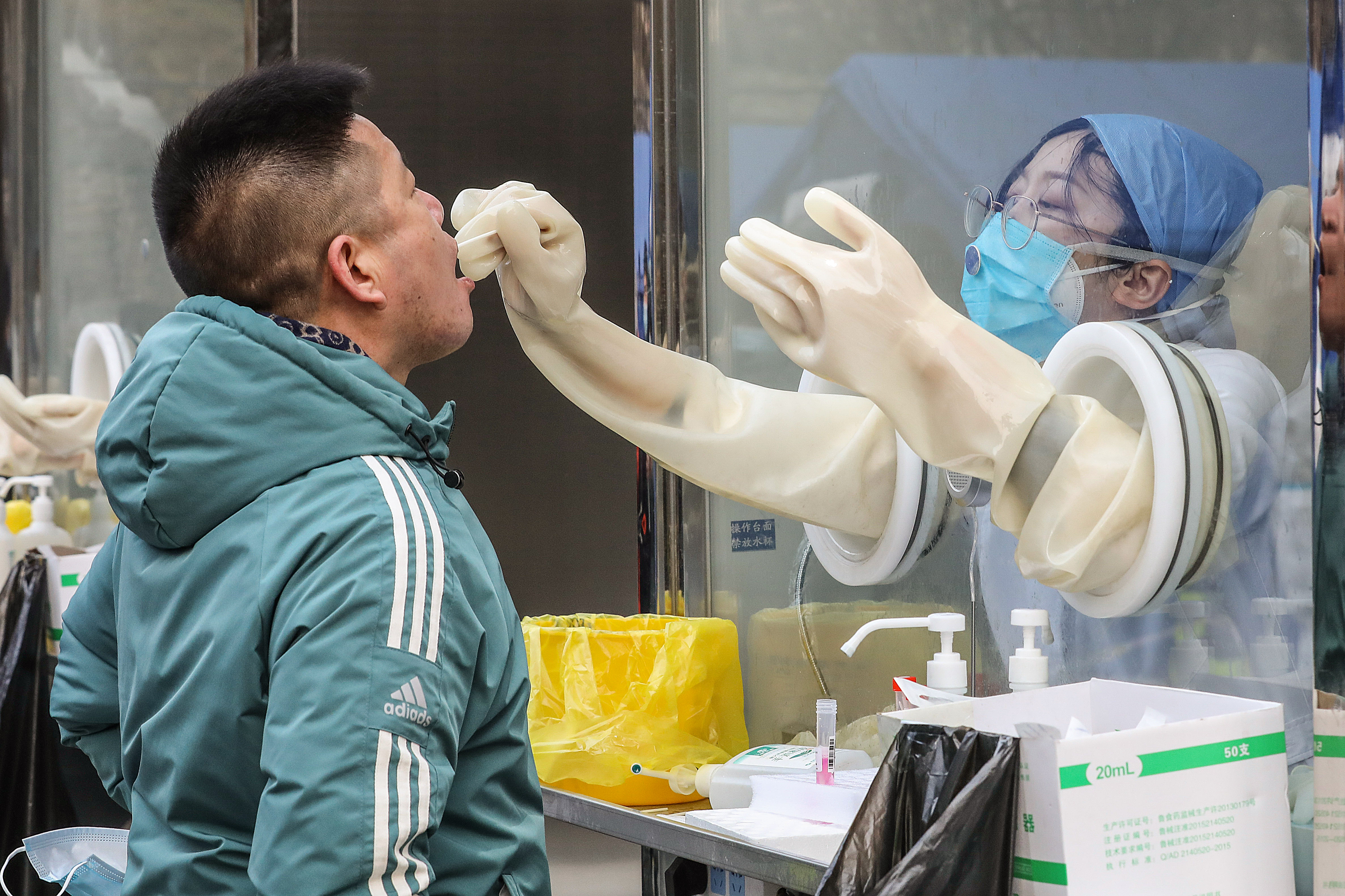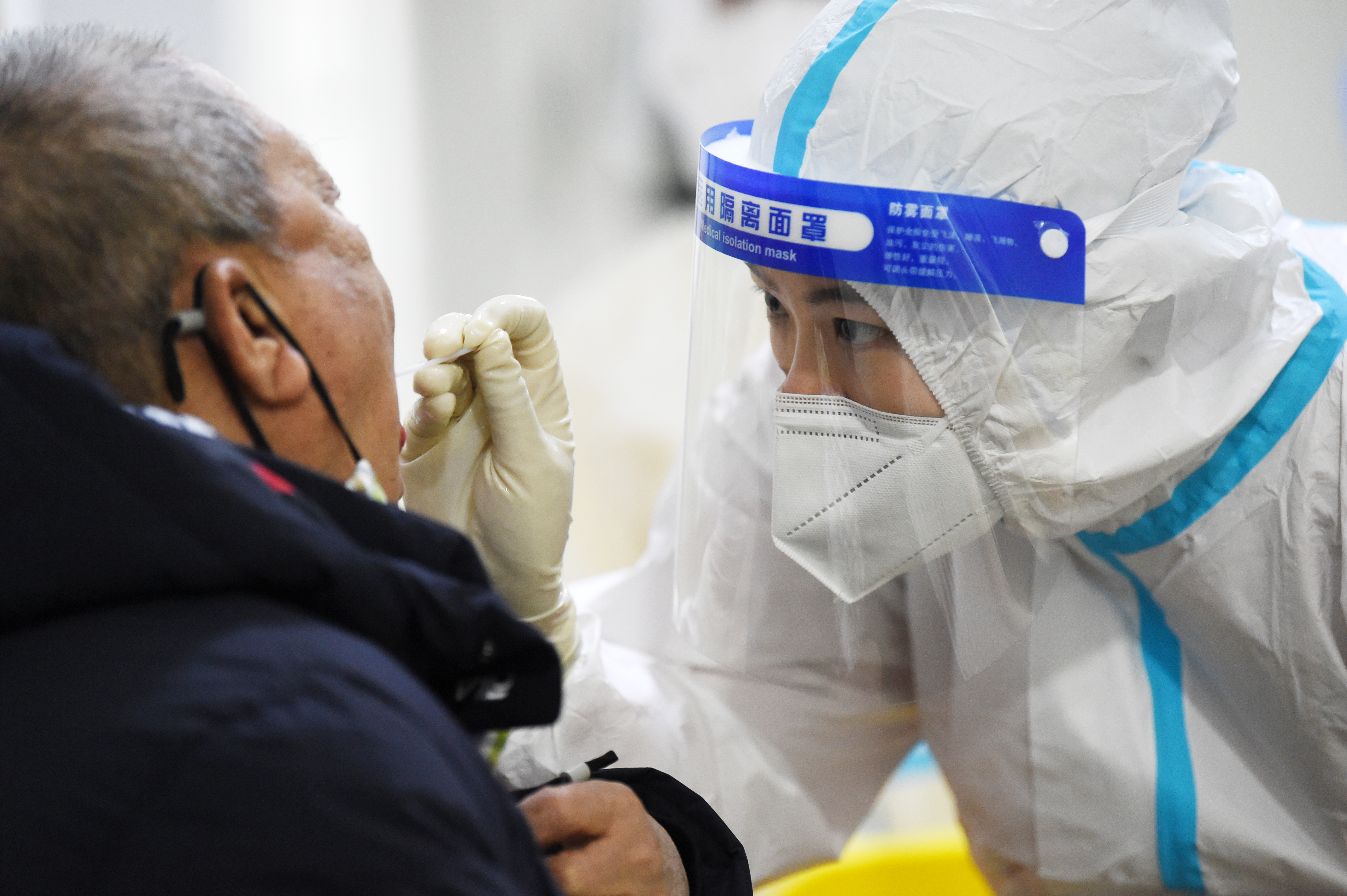 1月22日,在哈尔滨市奋斗小学,医务人员采集核酸样本。新华社记者 王建威 摄