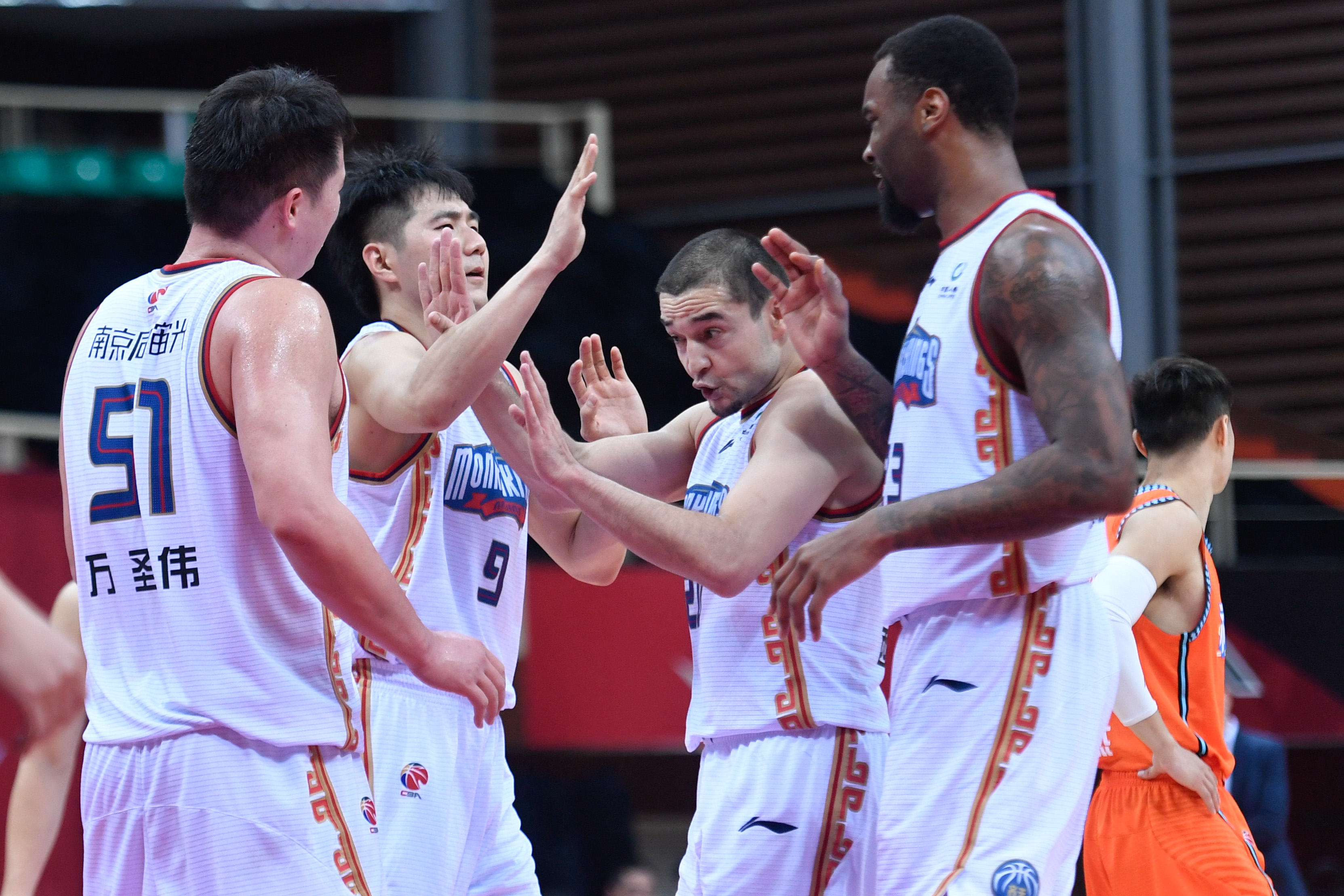 南京队球员乔文瀚(左二)、西热力江(左三)等在比赛中庆祝得分。新华社记者黄宗治摄