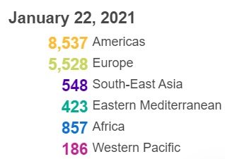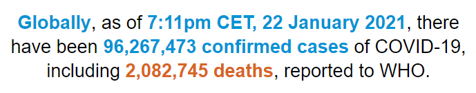 根据世卫组织最新实时统计数据,截至欧洲中部时间1月22日19时11分(北京时间1月23日2时11分),全球累计新冠肺炎确诊病例96267473例,累计死亡病例2082745例。22日全球新冠肺炎确诊病例新增624353例,死亡病例新增16079例。(总台记者 朱赫)