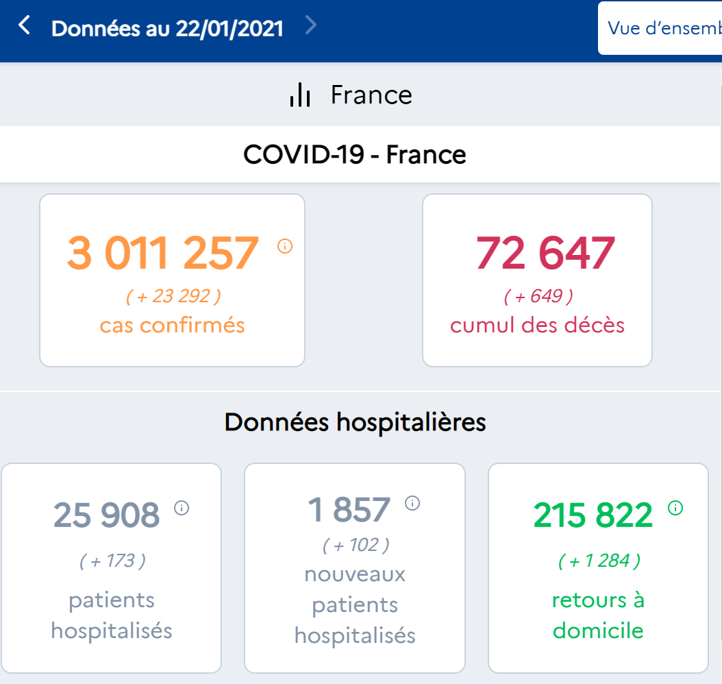 法国政府网站1月22日当天公布的数据显示,截至当天下午,法国新增新冠肺炎确诊病例23292例,累计新冠肺炎确诊病例达3011257例。累计报告死亡病例达72647例,较前一天增加649例。