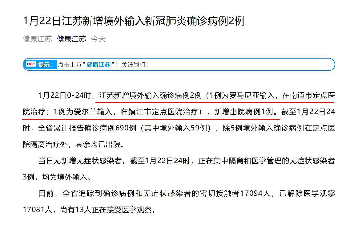 1月22日0—24时,江苏新增境外输入确诊病例2例(1例为罗马尼亚输入,在南通市定点医院治疗;1例为爱尔兰输入,在镇江市定点医院治疗),新增出院病例1例。