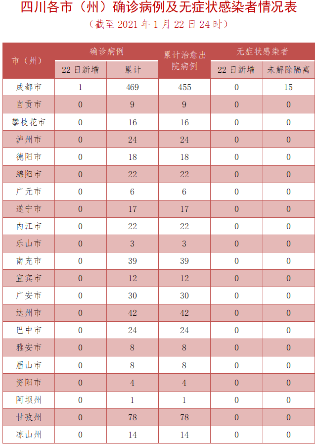 1月22日0—24时,四川省无新增无症状感染者,当日转为确诊病例0例,当日解除集中隔离医学观察0例。尚在集中隔离医学观察15例(境外输入14例,本地1例)。