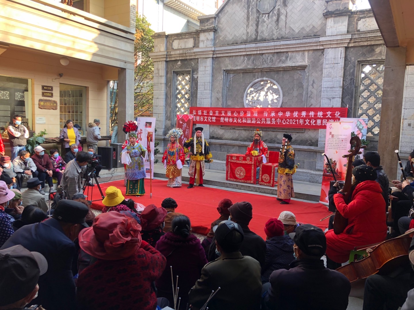 近日,在位于昆明市文化和旅游公共服务中心的一个庭院里,滇剧《大登殿》吸引众多市民前来观看,这里面有“老戏骨”,也不乏看热闹的年轻人。