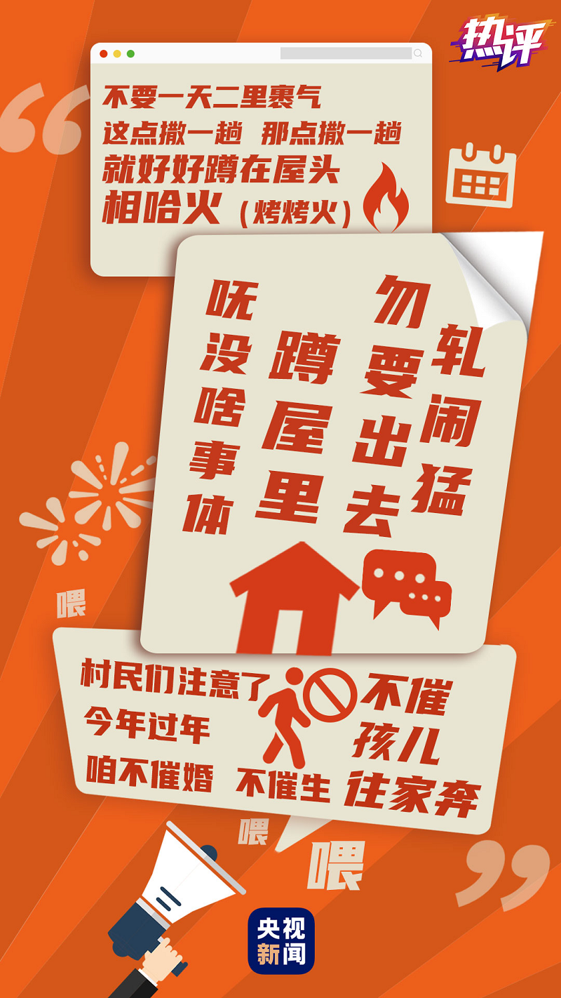春节临近,多地倡导就地过年、不到处串门,各种地方话防疫宣传又上新了。上海市发布沪语版防护海报,“呒没啥事体蹲屋里,勿要出去轧闹猛”。曾用大喇叭喊话防疫的“河南村长”则来了一段“硬核”喊话,“今年过年,咱不催婚、不催生,不催孩儿往家奔”。多地推出的防护海报、防疫顺口溜、乡村大白话广播等等,让人倍感亲切。