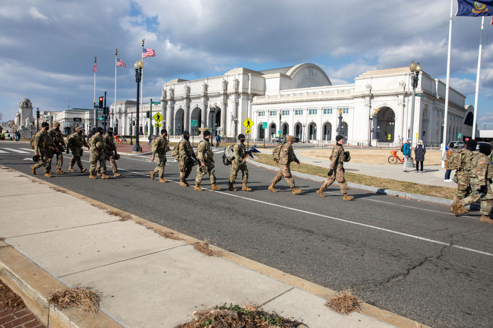 1月20日,在美国华盛顿,国民警卫队队员从火车站附近走过。(新华社发)