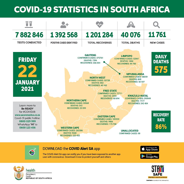 当地时间1月22日,南非卫生部确认该国当天新增新冠肺炎确诊病例11761例,累计确诊病例达1392568例;新增死亡病例575例,累计死亡40076例;累计治愈1201284例。