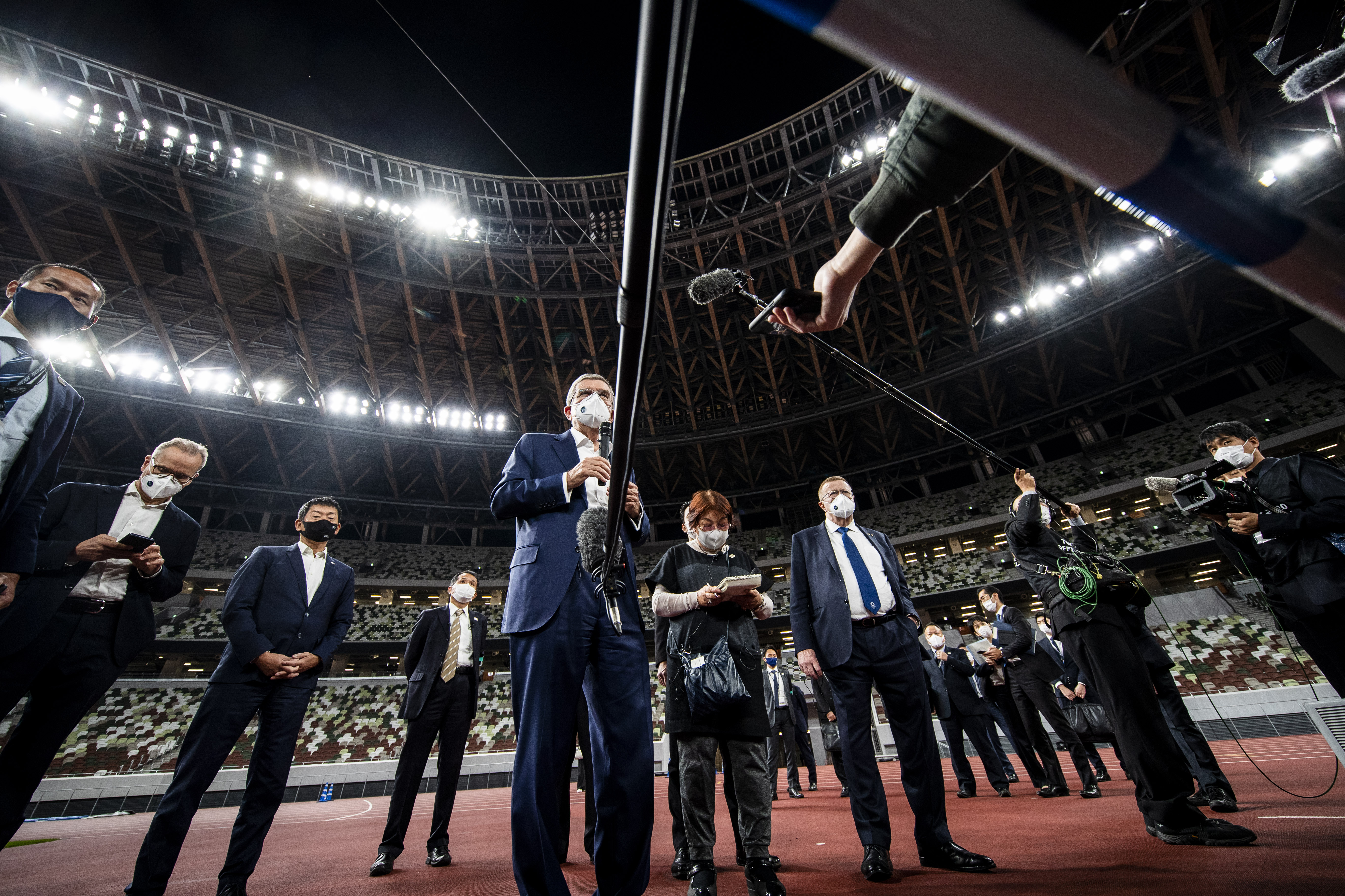 2020年11月17日,国际奥委会主席巴赫(左五)在参观新国立竞技场时回答媒体记者提问。新华社/POOL/贝赫鲁兹·迈赫里