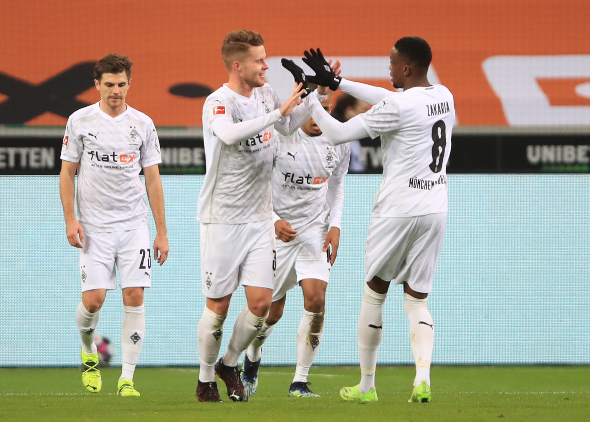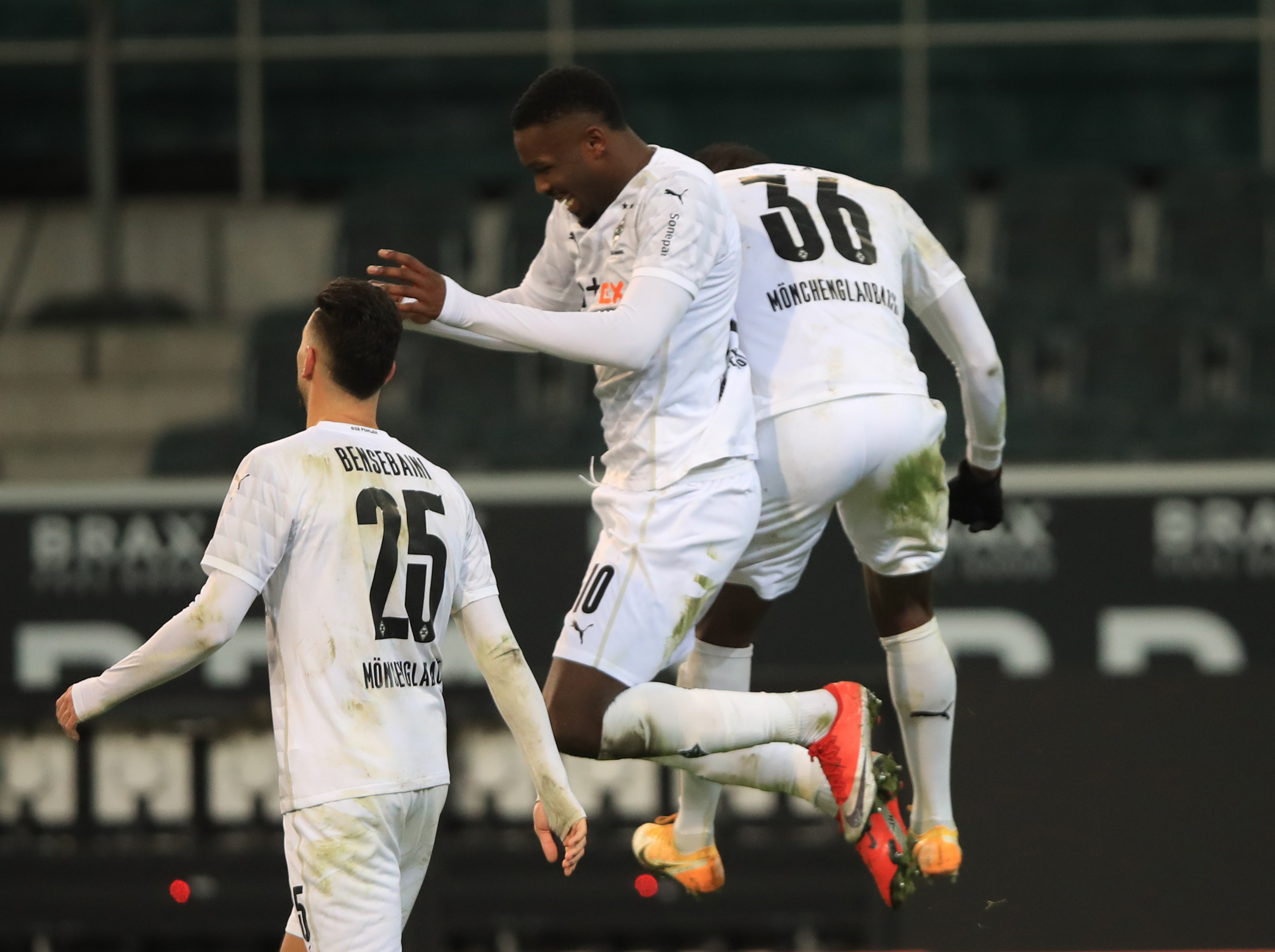 1月22日,门兴格拉德巴赫队球员图拉姆(中)在比赛中庆祝进球。新华社/路透