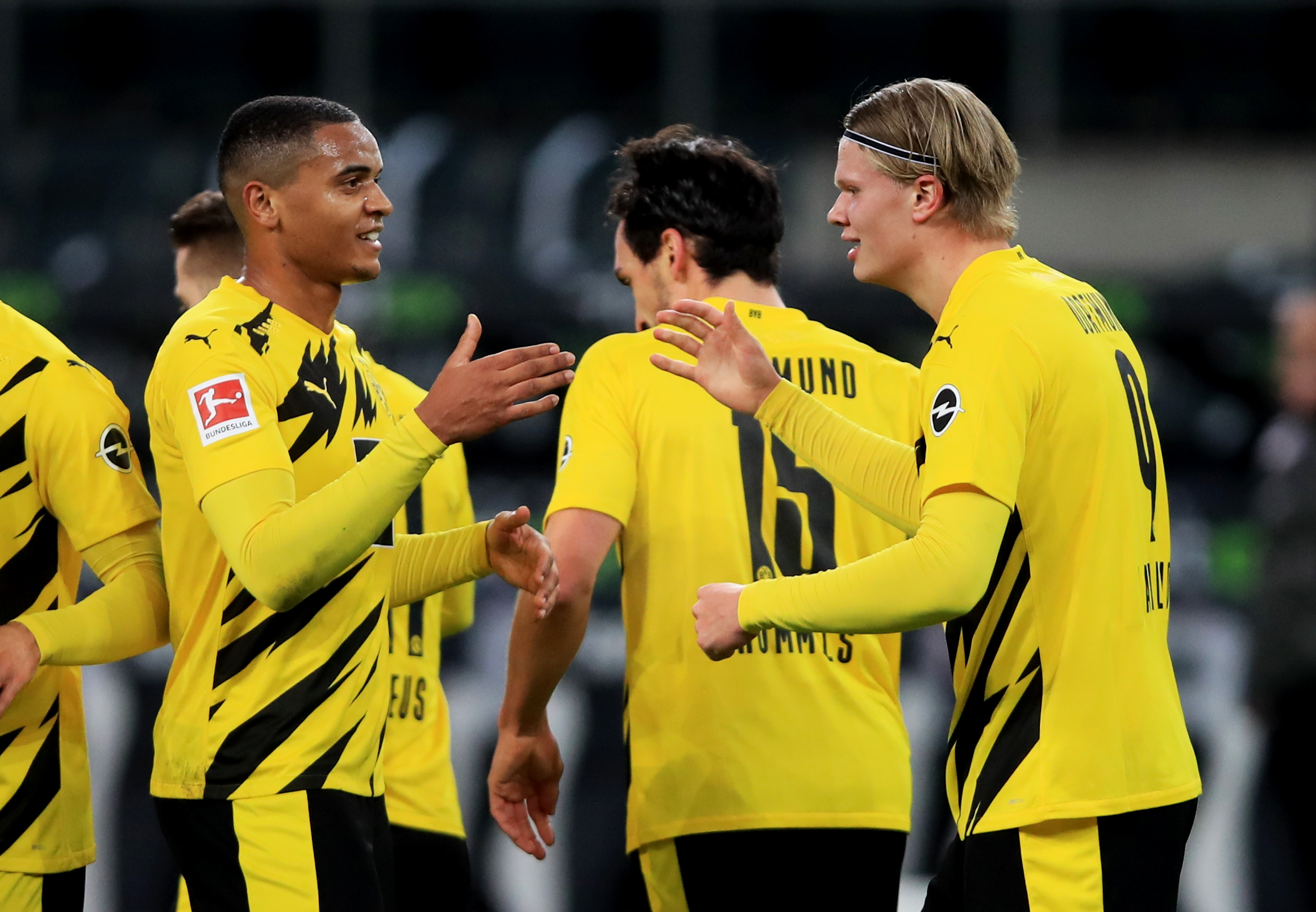 1月22日,多特蒙德队球员哈兰德(右一)进球后与队友庆祝。新华社/路透