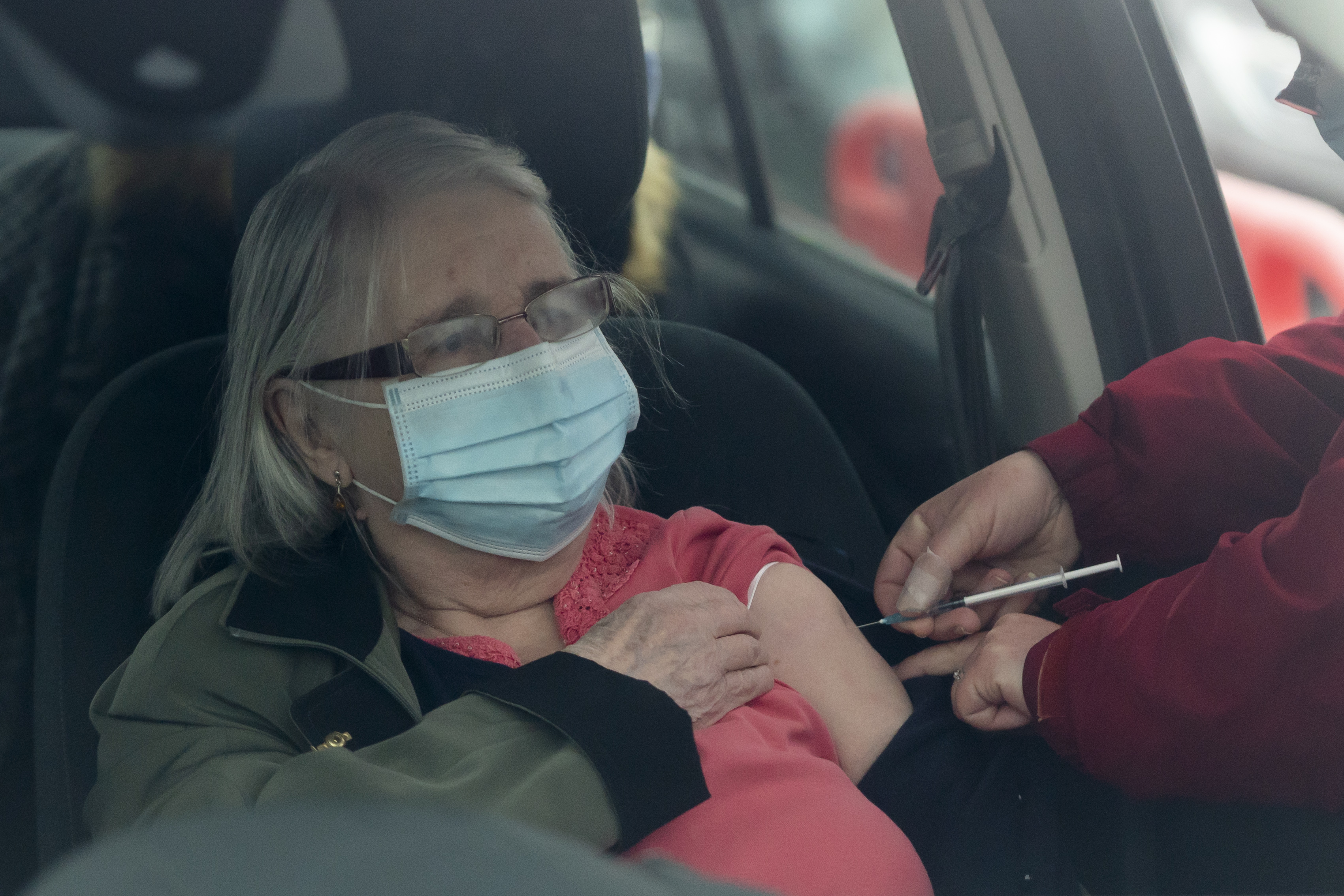 1月7日,在英国大曼彻斯特郡海德,一名女子坐在车内接种新冠疫苗。(新华社发,乔恩·休珀摄)