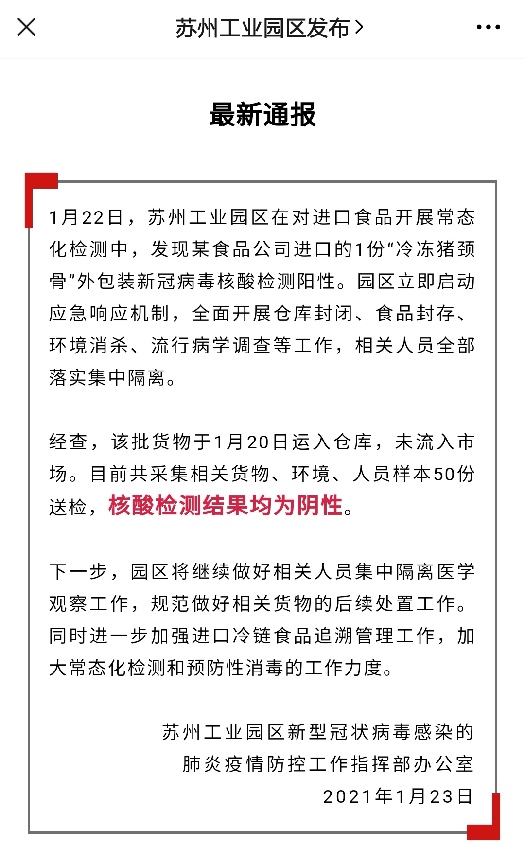 1月22日16时55分,苏州工业园区在对进口食品开展常态化检测中,发现某食品公司进口的1份“冷冻猪颈骨”外包装核酸检测阳性。园区立即启动应急预案,组织开展食品封存、环境消杀、流行病学调查等工作,相关人员全部落实集中隔离。