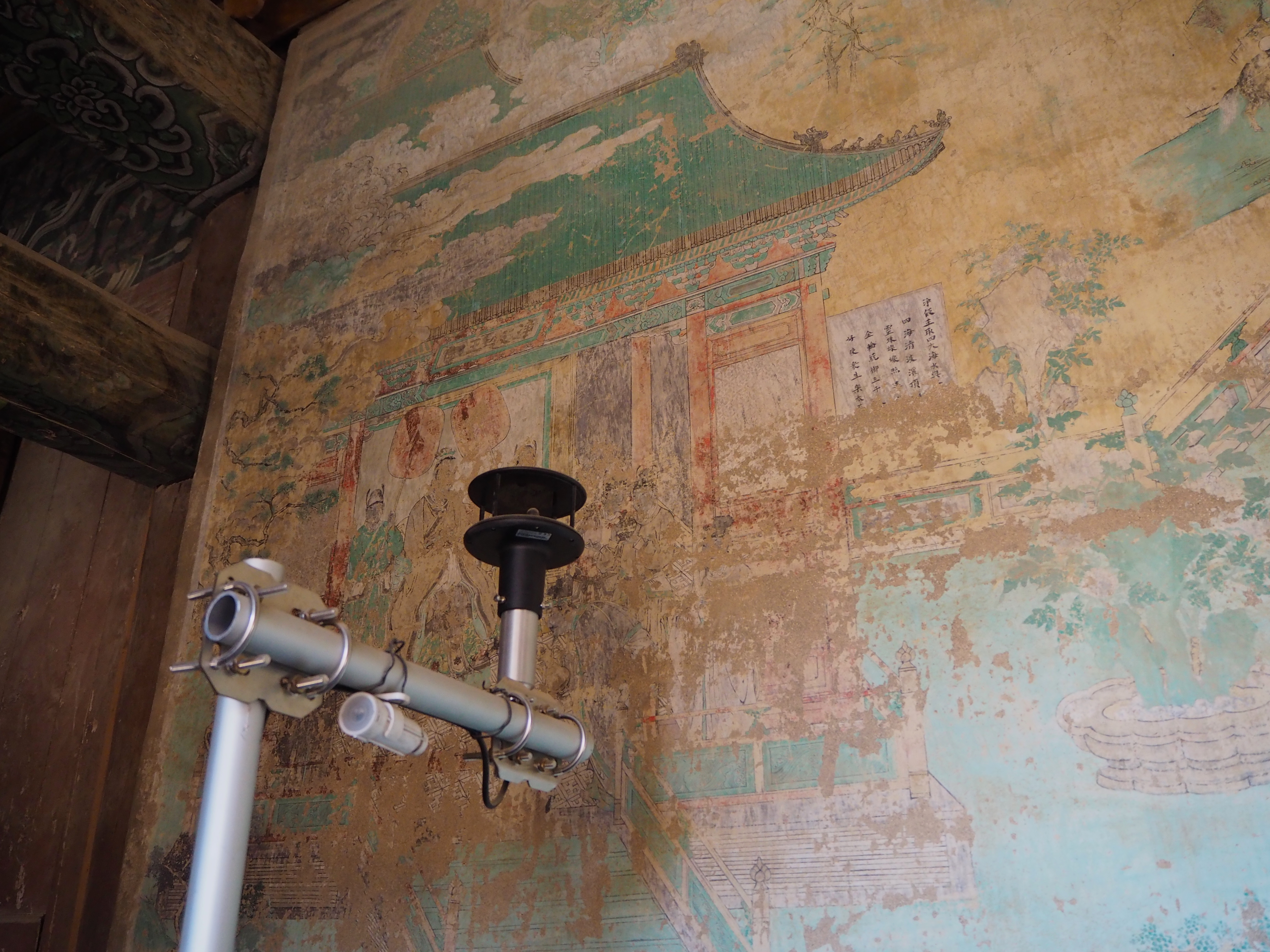 敦煌研究院团队安置在瞿昙寺明代壁画前的风场检测仪器(1月21日摄)。新华社记者 白玛央措 摄