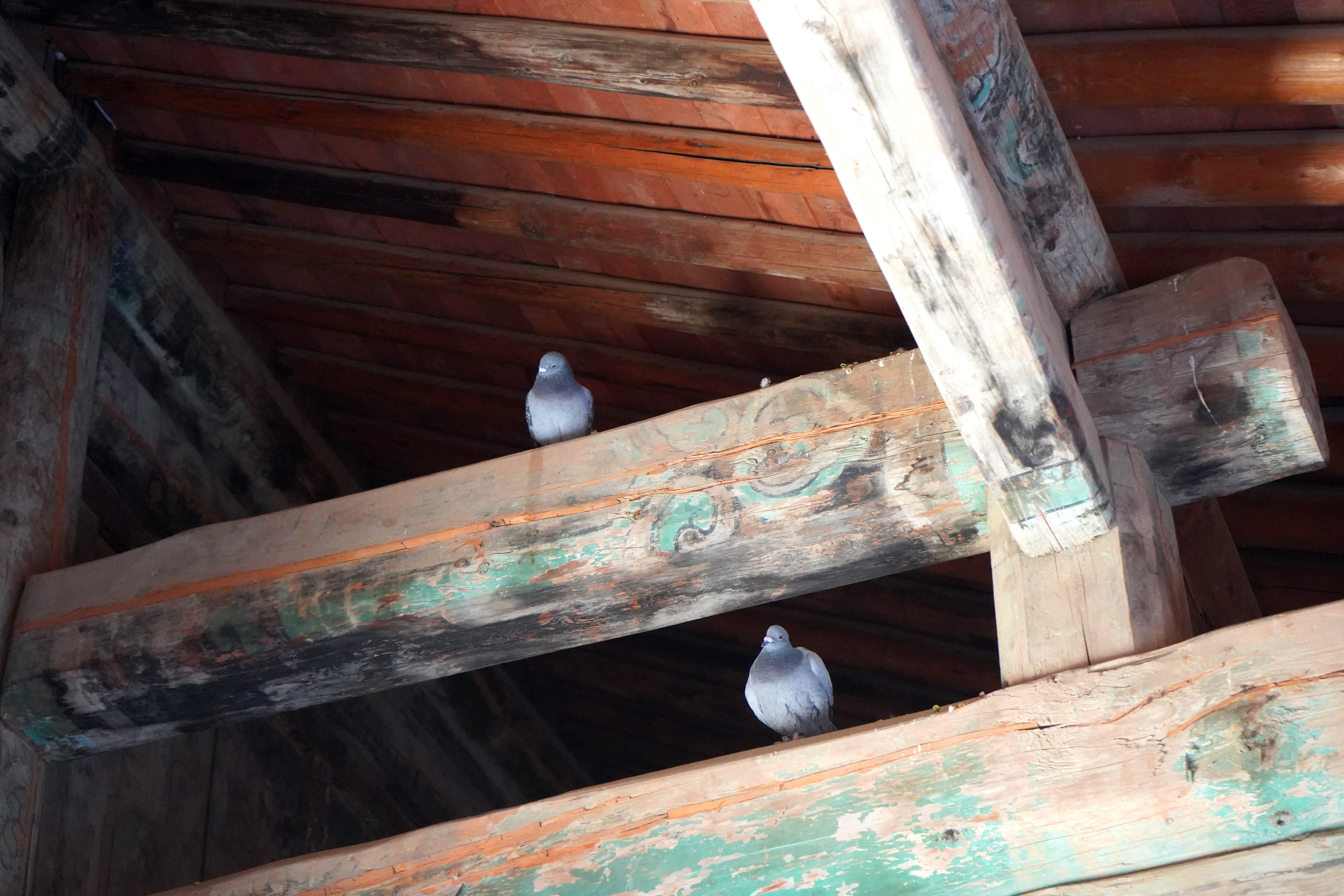 瞿昙寺殿内房梁上的鸽子(1月21日摄)。新华社记者 严赋憬 摄