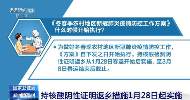 为做好冬春季农村地区新冠肺炎疫情防控工作,《方案》自下发之日开始执行。持核酸检测阴性证明返乡从1月28日春运开始后实施,至3月8日春运结束后截止。